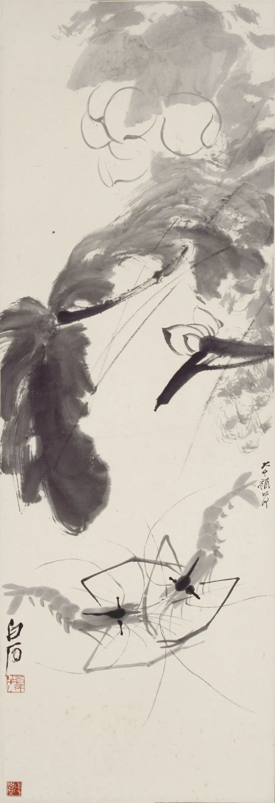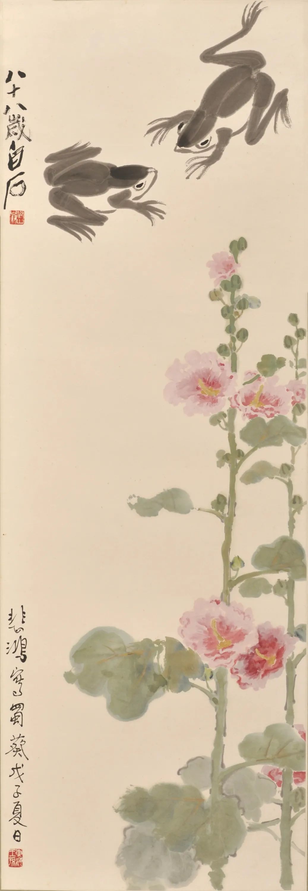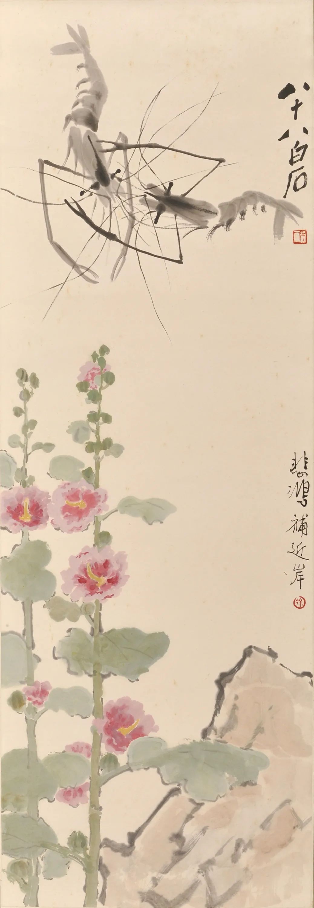 在这一部分,我们可以看到1948年徐悲鸿同张大千分别与齐白石合作的四件作品。《蜀葵蛙》与《蜀葵虾》是徐悲鸿与齐白石二人合作,2副《荷虾图》是齐白石与张大千合作作品。据策展人徐冀介绍,这四件作品也许是齐、张二人分别与悲鸿先生合作之后有意全部留赠悲鸿先生,以答谢近20年来徐悲鸿先生对二人的推崇有加之情谊。