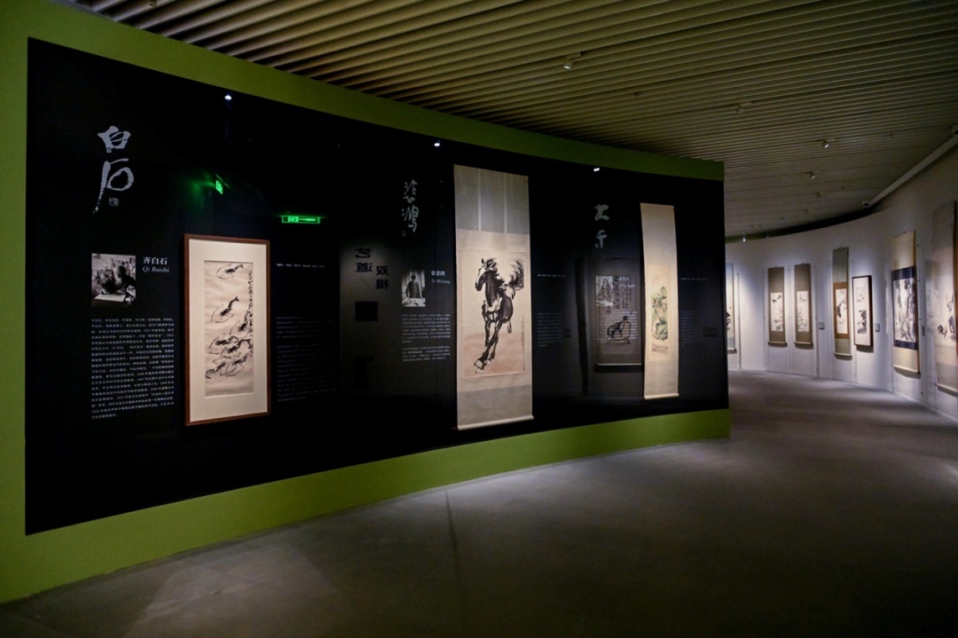 徐悲鸿笔下的“追风奔马”、齐白石画的的“游嬉青虾”、张大千的“彩墨山水”可谓是他们的标志性风格作品,家喻户晓。在展览开篇就以“对画”的形式展出了这三位大师极具代表性的作品,齐白石的《虾》、徐悲鸿的《奔马》以及张大千的《黄山》等经典作品在本次展览中齐聚。