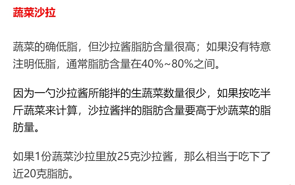 点沙拉时,可以让厨师将沙拉酱单独放小碟里,自己决定放多少;或干脆别用沙拉酱,加蒜醋汁自己动手做成“中式大拌菜”。