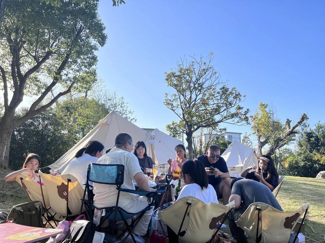 来自浦东的宋女士一行今年首次尝试通过露营来崇明休闲度假,在野外支起桌椅,倒上红酒,仪式感十足。