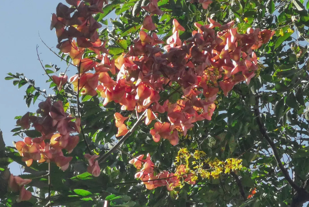工作人员表示,目前栾树已处于盛花期,有些栾树已经结果,因此造就了黄红相间的美丽景观,市民可以同时欣赏栾树的花和果。等到了十月,更多的蒴果会挂上枝头。