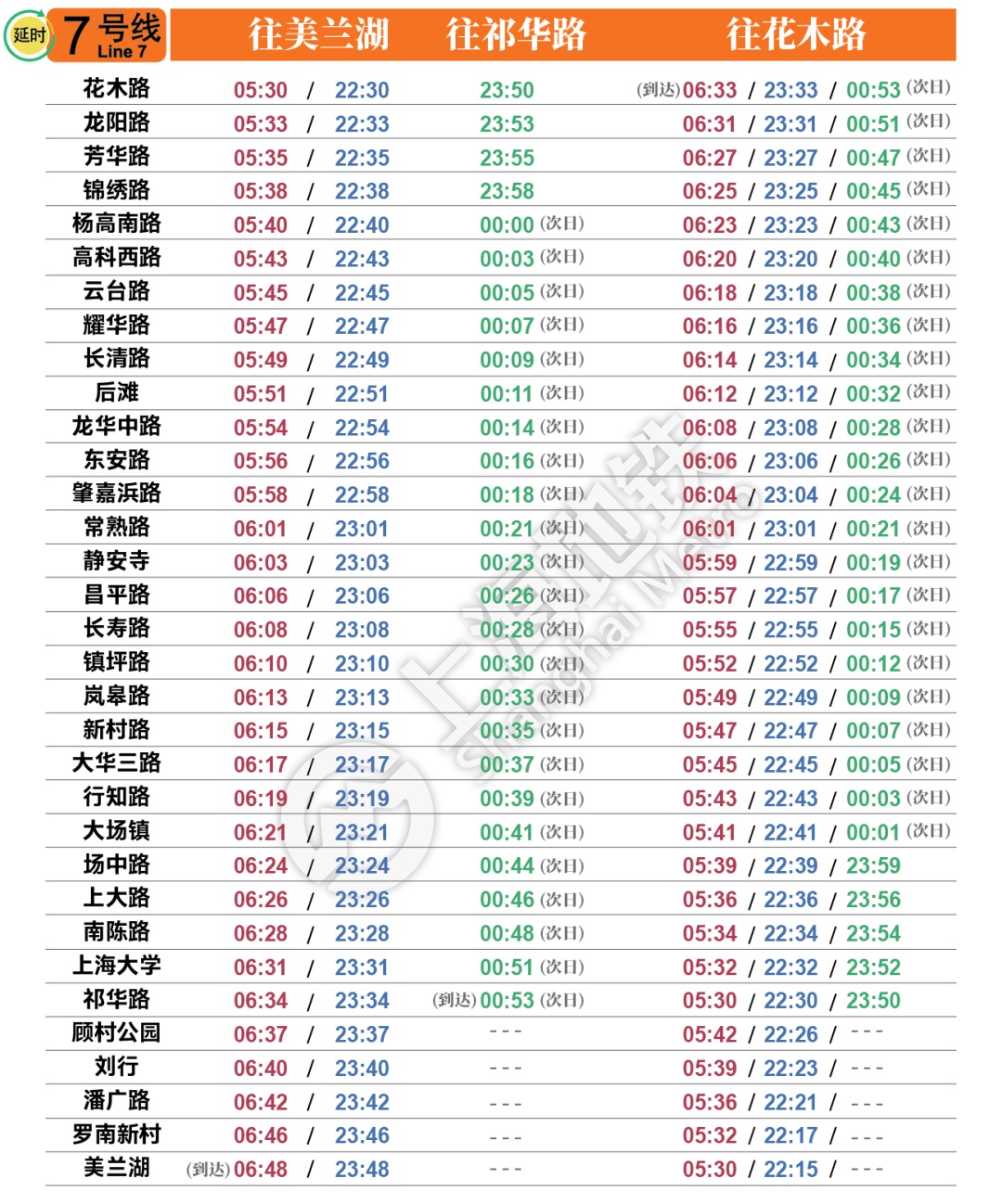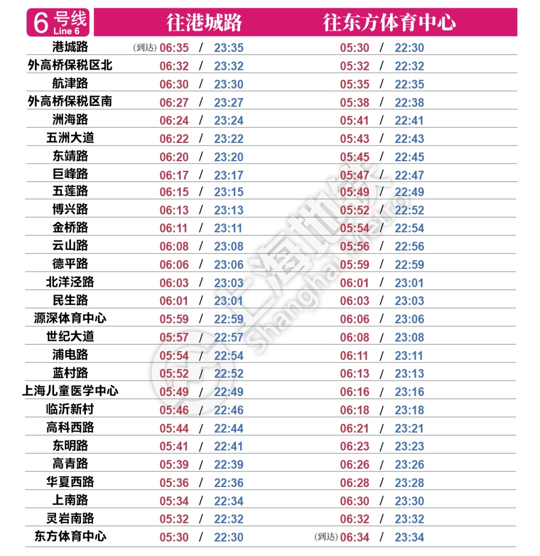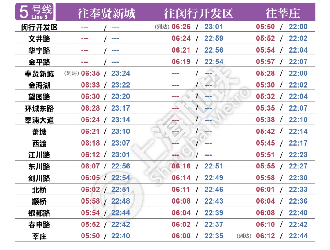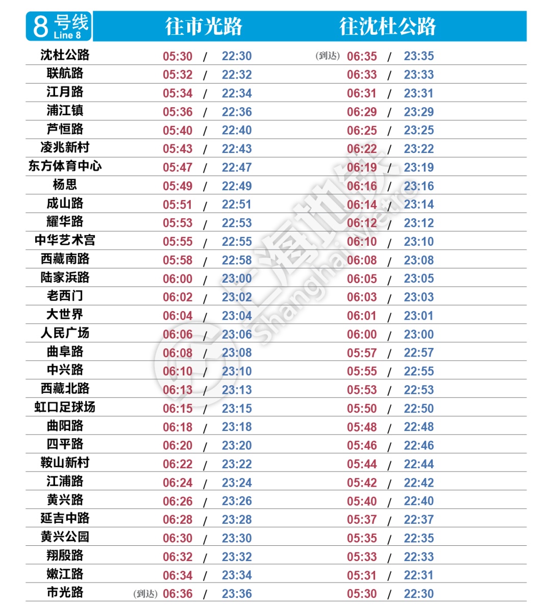 申通地铁集团说,今天(10月8日)起,浦江线(汇臻路站-沈杜公路站)全线首班车将提前30分钟,整体运营时间有所延长、列车间隔维持不变。上海地铁各线首末班车时刻表也随之更新,小伙伴们记得收藏哦!