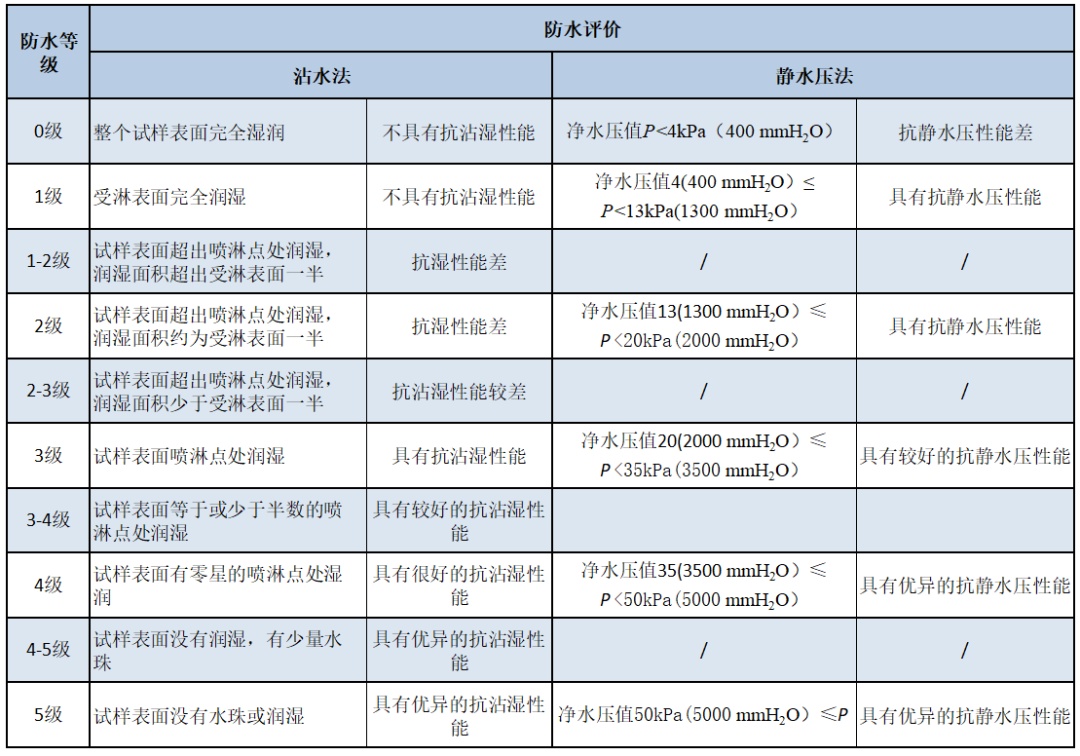 小知识: 纺织品的防水性能的检测常用两种方法,一种是沾水法,另一种是静水压法,两种方法的防水等级描述如下表,可供选购时参考。