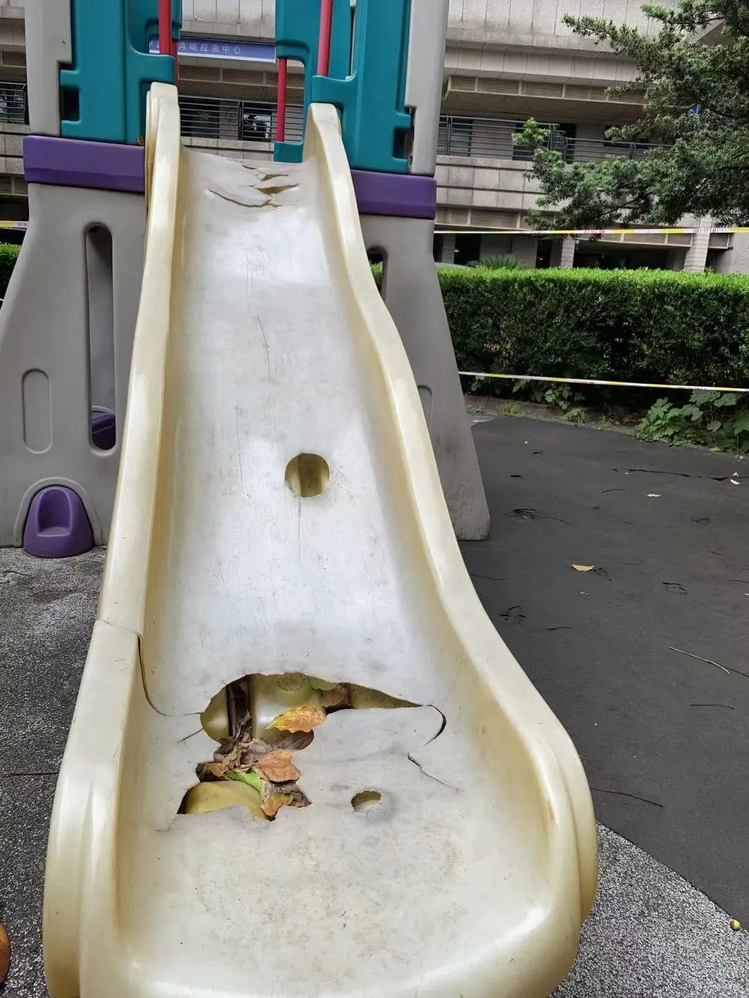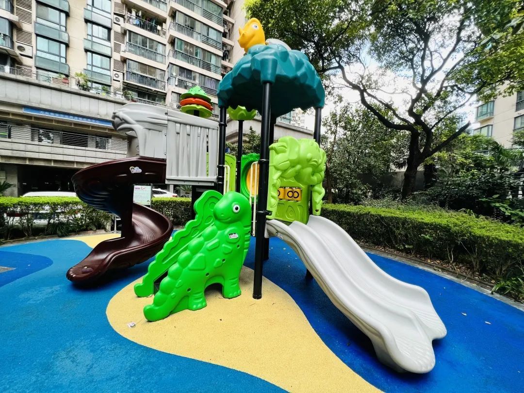 曾经破烂不堪、闲置多年的滑梯城堡,摇身一变成了造型可爱、主题鲜明、拥有三个滑梯的“侏罗纪恐龙堡”。