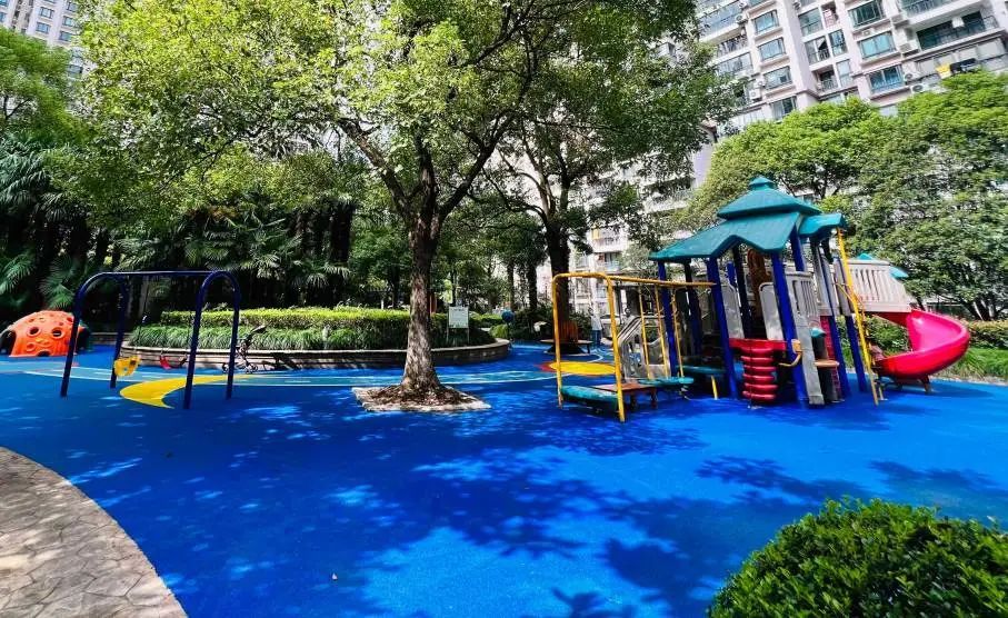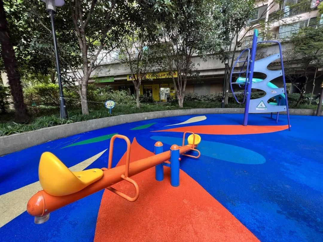 经过修缮更新,儿童乐园原先破烂不堪的地面被彩色橡胶颗粒所覆盖,设计成赛道、河流主题,色彩鲜明、充满童趣,深得孩子们的喜爱。国庆长假,这里更是成了人气爆棚的“网红打卡点”。