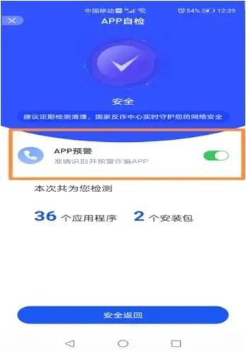 注册成功后,点击“APP自检”(仅安卓系统)再点开“APP预警”,即可自行检测手机中存在诈骗风险的APP。