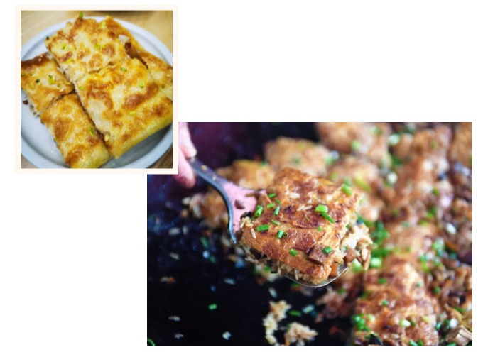 豆皮先将蛋皮双面煎至外表金黄,再包入用猪肉、香菇和笋丁等炒成的糯米饭,最后切成方正的小块。油泽饱满、不干不柴、酥脆鲜糯,一口下去,简直太满足了!