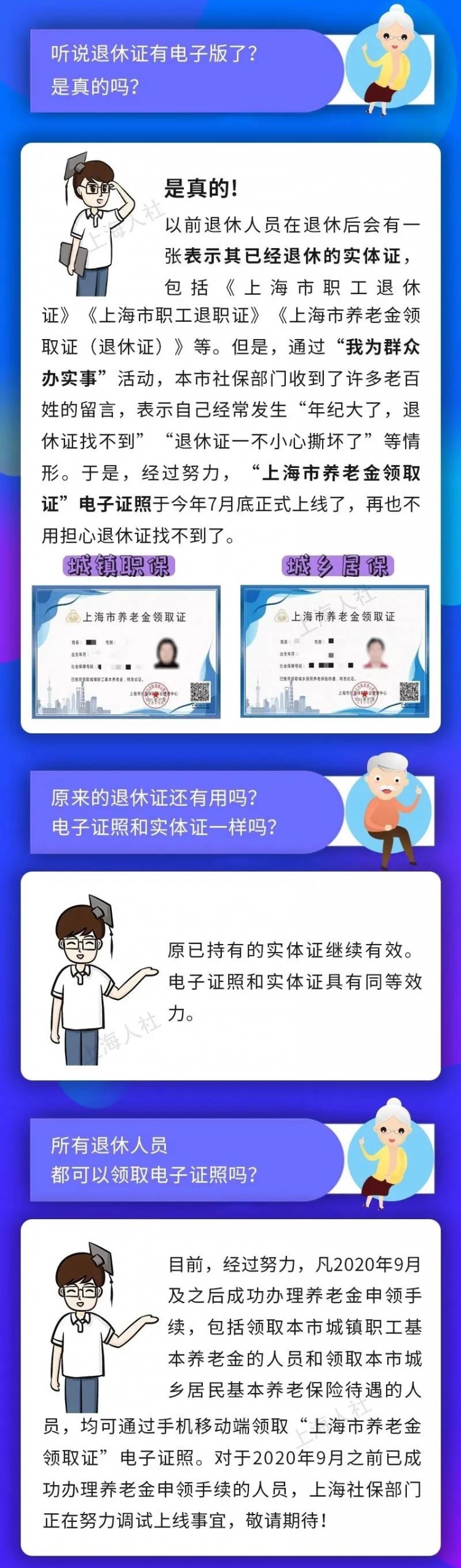 你知道吗?退休证也有电子版了。市人社局说,2020年9月及之后成功办理养老金申领手续的人员,均可通过手机移动端领取“上海市养老金领取证”电子证照,随时随地手机“亮证“。具体如何领取呢?详见↓责任编辑 倪莉琪来源 上海发布