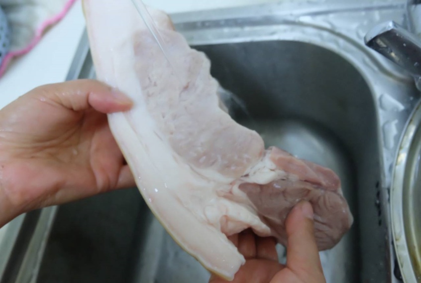 第三种是水洗的猪肉!这种肉说白就是变质了,用手触摸会发黏,所以用水冲洗后,再用手触摸就不会用发黏的手感,最后再放在给猪肉“美颜”的“猪肉灯”下,这样猪肉的颜色就漂亮多了!