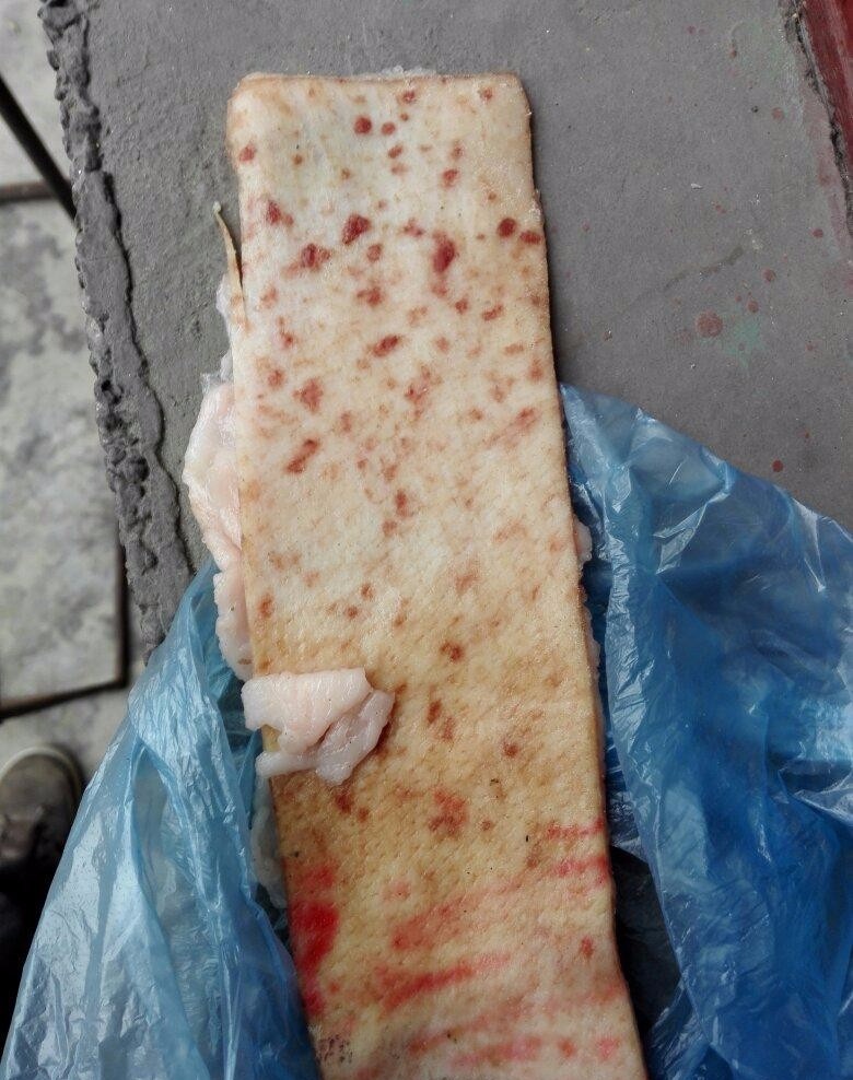 第三种是病死猪肉,一般这种肉一眼就能看出来,因为这种肉的外观看起来有颜色较深的血点,并且在肥肉中也会有深色的血块等,除非是绞成肉馅才能让人看不出来。