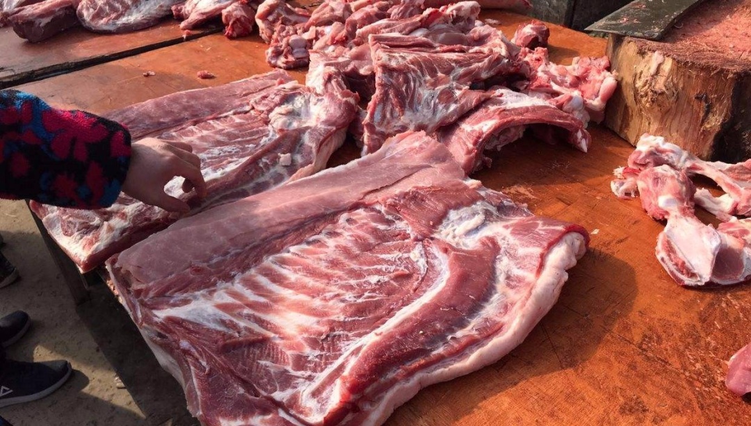 其次,遇到挂着的和摆放在案板上的肉,要选挂着的猪肉!