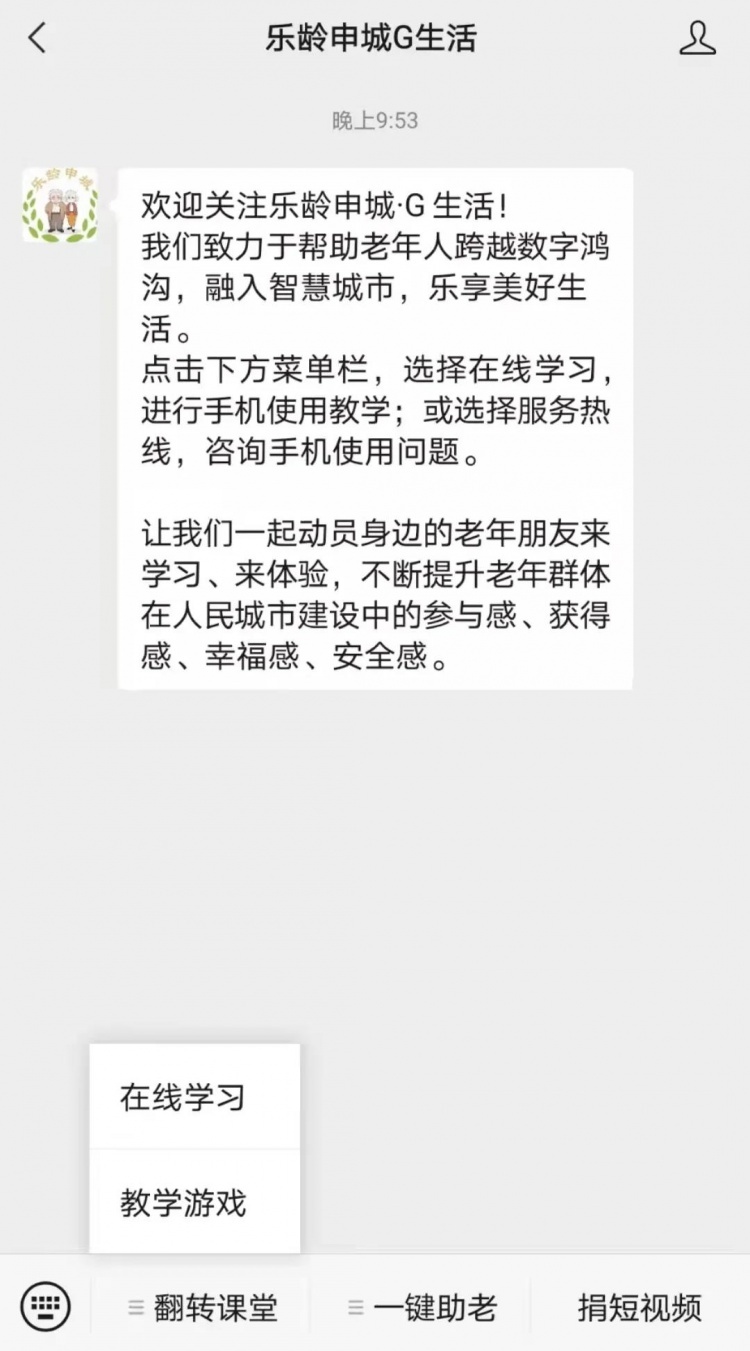 由市委老干部局、市文明办、市卫健委、市经信委、市通信管理局、市科协共同主办发布的上海市“乐龄申城 G生活”志愿服务活动之“乐龄码”,旨在帮助老年人融入数字化生活,主要由学习、服务、传播三大场景构成。其中,“学习场景”分为“线上学习”和“线下辅导”两种学习模式。可以通过个人微信账号扫一扫“乐龄码”,进入“乐龄申城·G生活”,然后点击“翻转课堂”,即可参加“在线学习”。