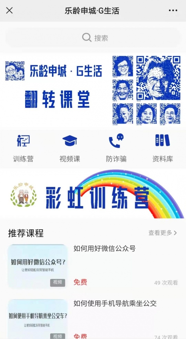为吸引和激发老年人学习智能手机兴趣,“在线学习”中开设了老年人可“组团建群”的“彩虹训练营”,使智能手机的学习和培训不仅限于一个人看视频自学,而是老年人可以和“有共同需求”的“老伙伴”们携手共学,只要老年人完成了“彩虹训练营”教学任务,取得结业证书,即可申请到一个自动生成、显示本人数字头像的“乐龄码”。