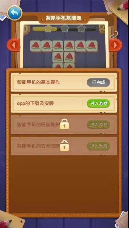 “教学游戏”为融趣味性、学习性、功能性于一体的“乐龄升G消消乐”。游戏的每道关卡都融合了概念学习、模拟实践和动手消消乐三个步骤,每一次的通关都意味着掌握了某个智能手机应用场景的操作方法。老年人初学智能设备应用后,可以利用这款游戏来模拟实际操作反复学、反复练,从而巩固学习成果。