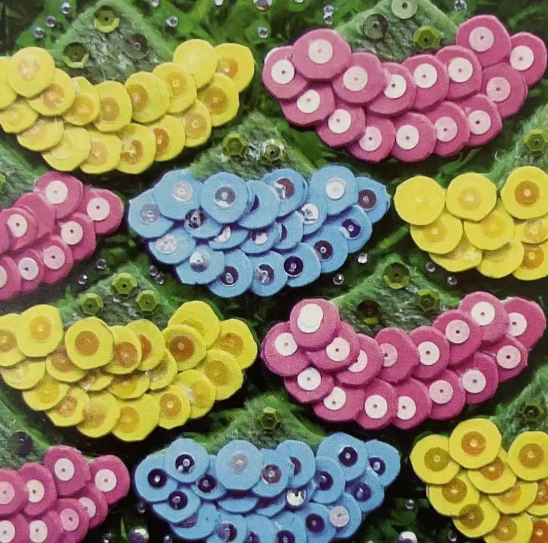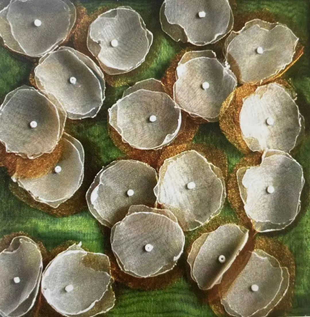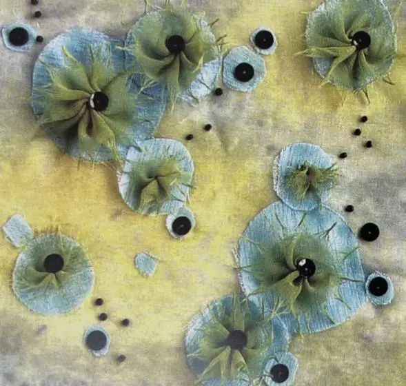 模仿微观状态下珊瑚虫在水中飘动的灵动效果。将白色雪纺纱和金色欧根纱裁成圆形,烧边后再用白色珠子钉缀在绿色面料上。