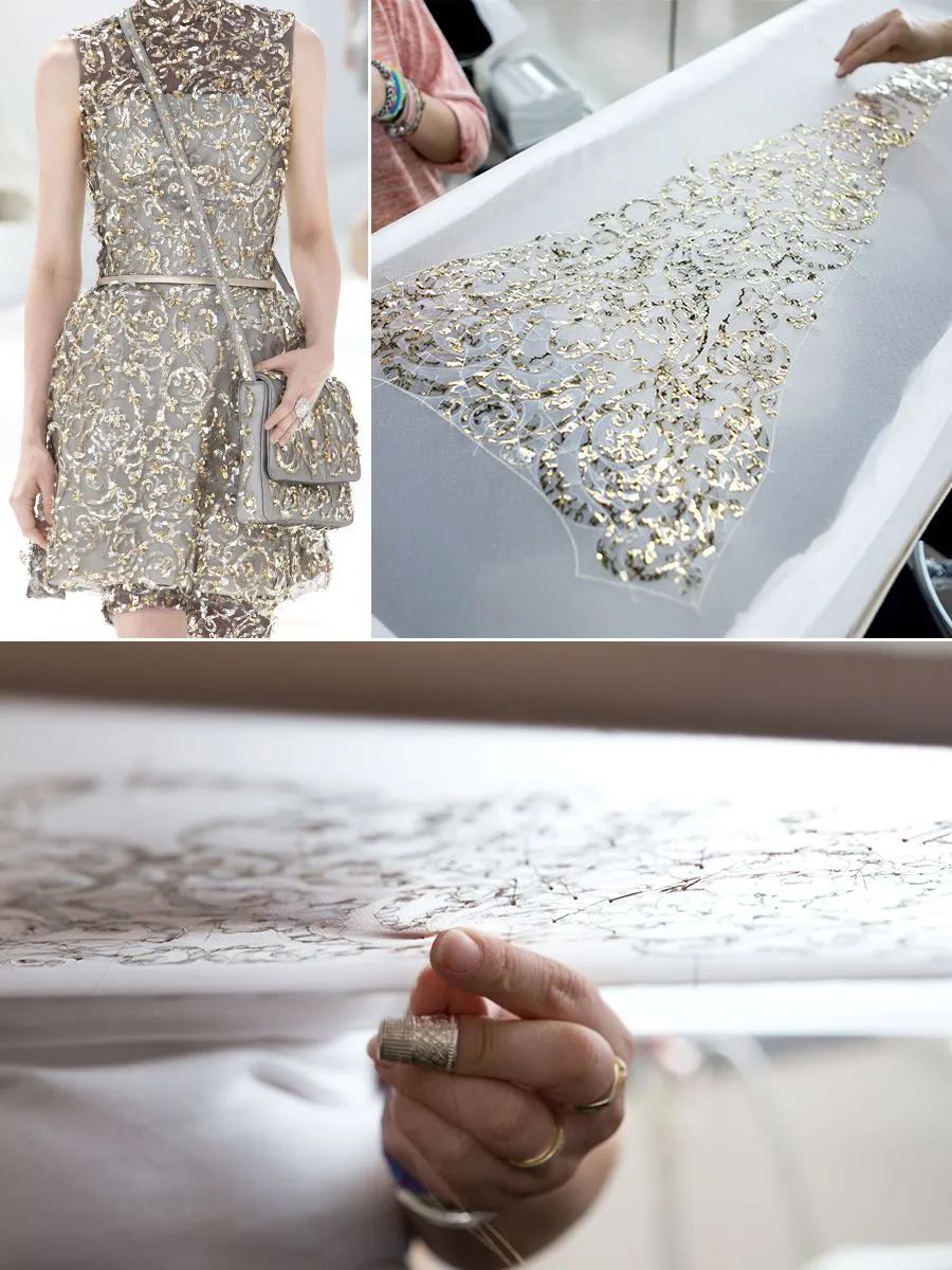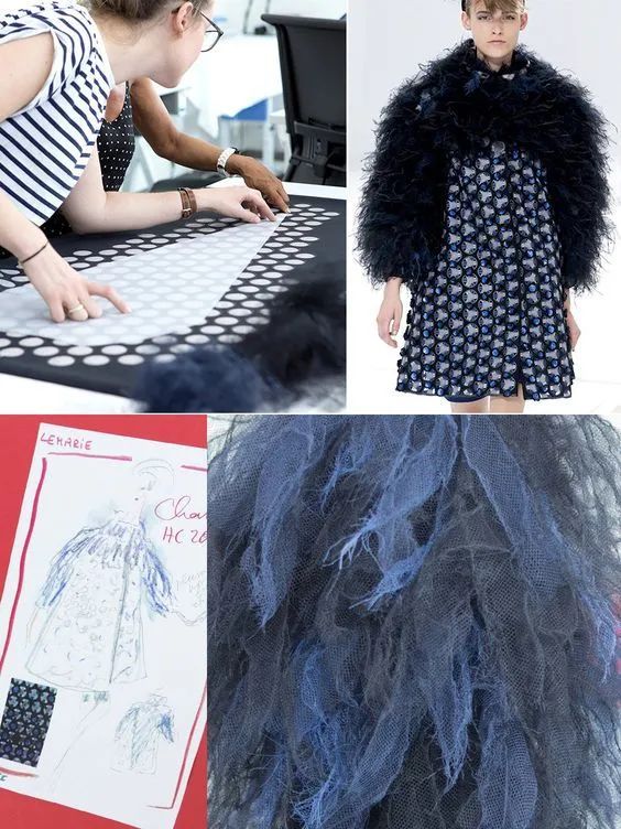 设计师要对面料进行各种工艺实验,从中摸索各种面料和不同工艺结合后的效果。构思过程是以实验为起点,通过对某种材料,某种加工方法进行试验,工艺实验往往具有偶发性和随意性的特点,设计师要将各种方法和效果进行比较,重新组合或者延续一些比较满意的设计效果继续发展,最后在工艺实验的方法和各种灵感图片中找到设计的交叉点,实现设计的主题化和系列化。