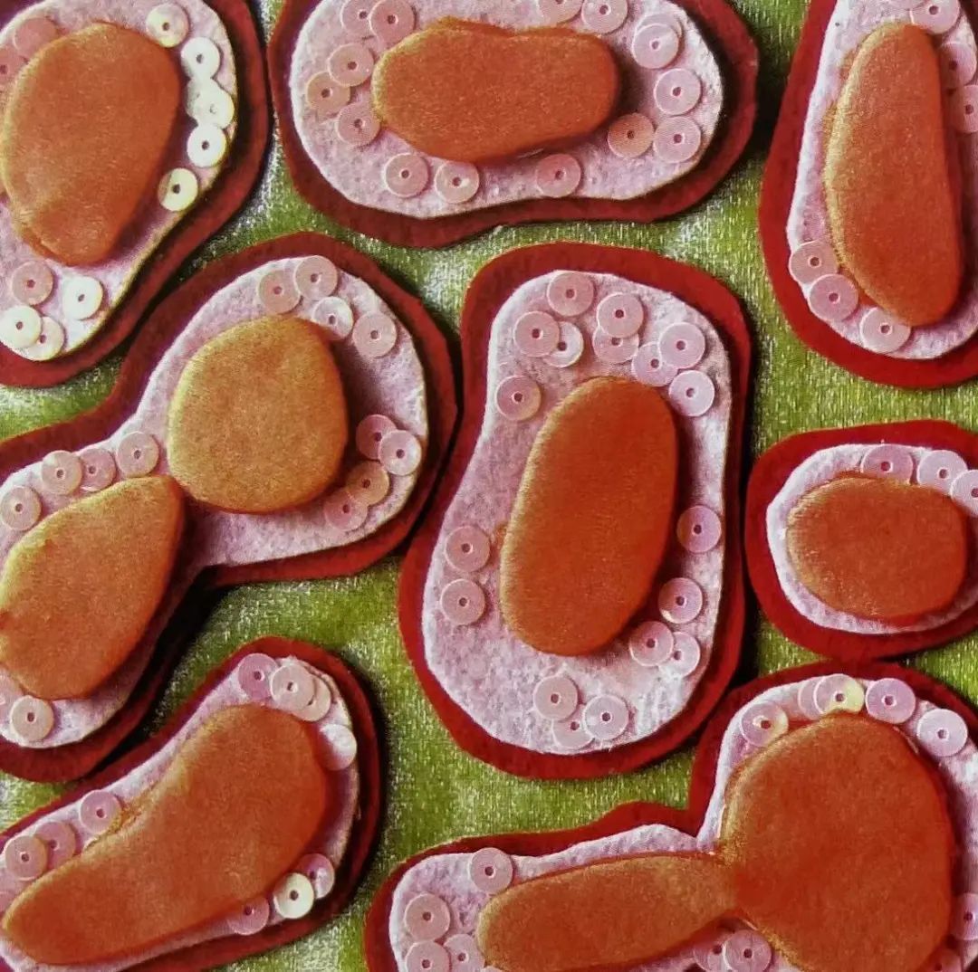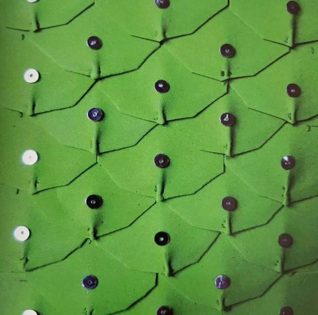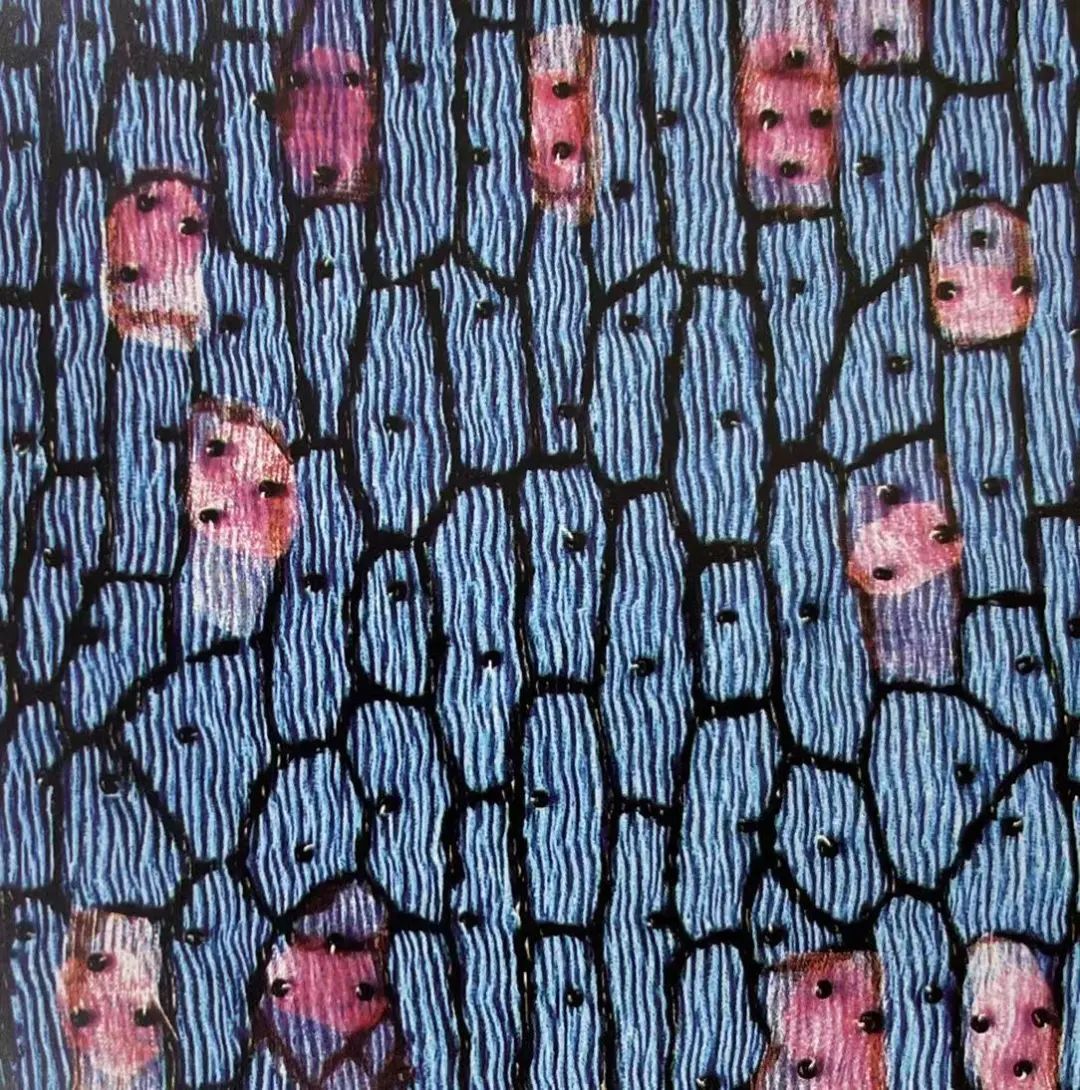 选择表面具有明显褶皱的面料作底,用特殊的胶质颜料在面料上绘出细胞的轮廓,再将黑色珠子和粉色透明纱片钉缀在黑色之间。胶质颜料干燥后会保持突起的触感并有光泽,与褶皱的底料形成肌理对比。