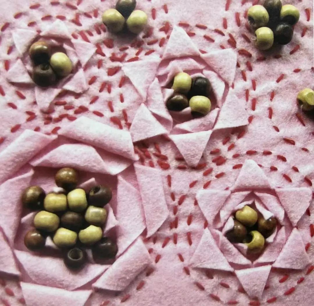 模仿石榴的底部花瓣,用几层粉色无纺布裁开层叠翻折,再用红色绗缝线迹勾勒出石榴的造型。