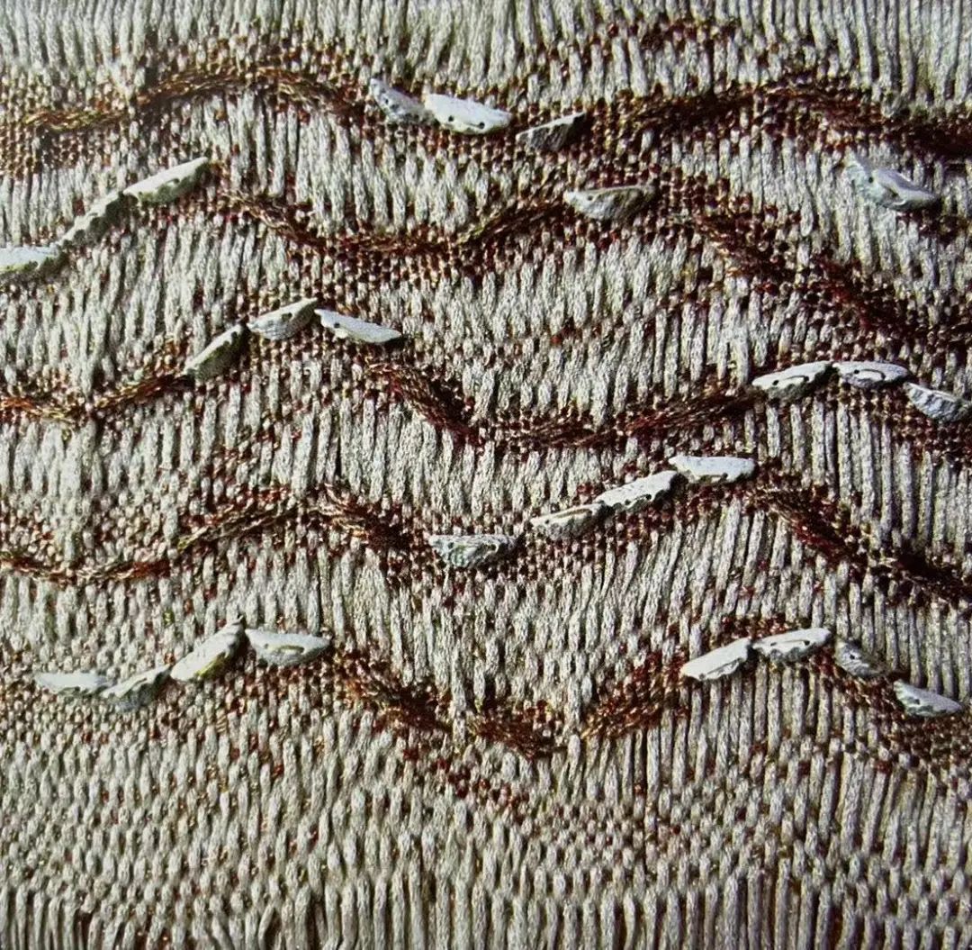 将一些贝壳珠子穿入纱线中,随着色彩的渐变效果,珠子散落在起伏的曲线中,如同退潮时海边沙滩的痕迹。