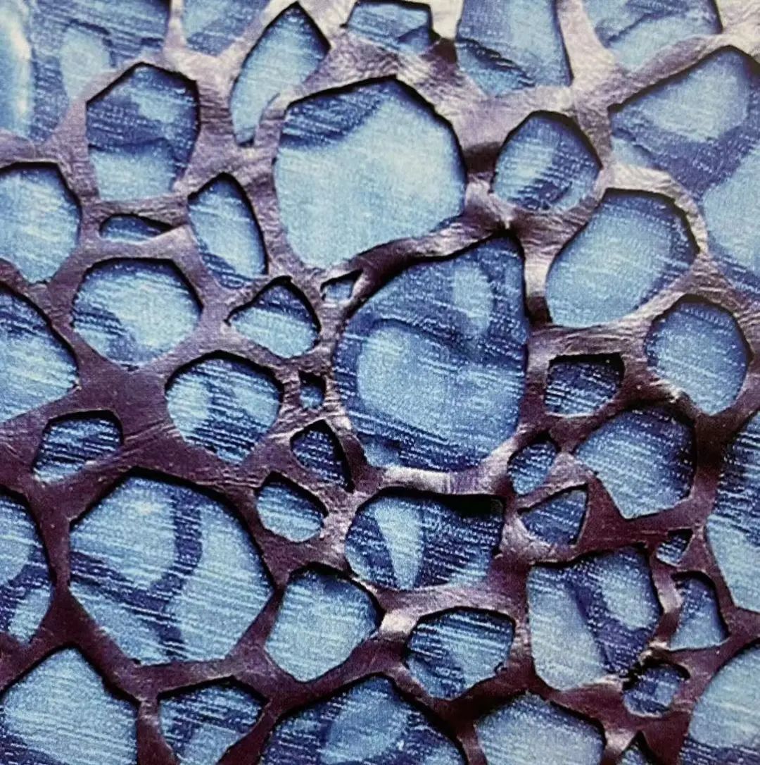 面料模仿泡沫在水中斑驳多重的光影效果。上下两层为皮革镂刻,中间用蓝色透明柯根纱间隔,形成多层重叠效果。