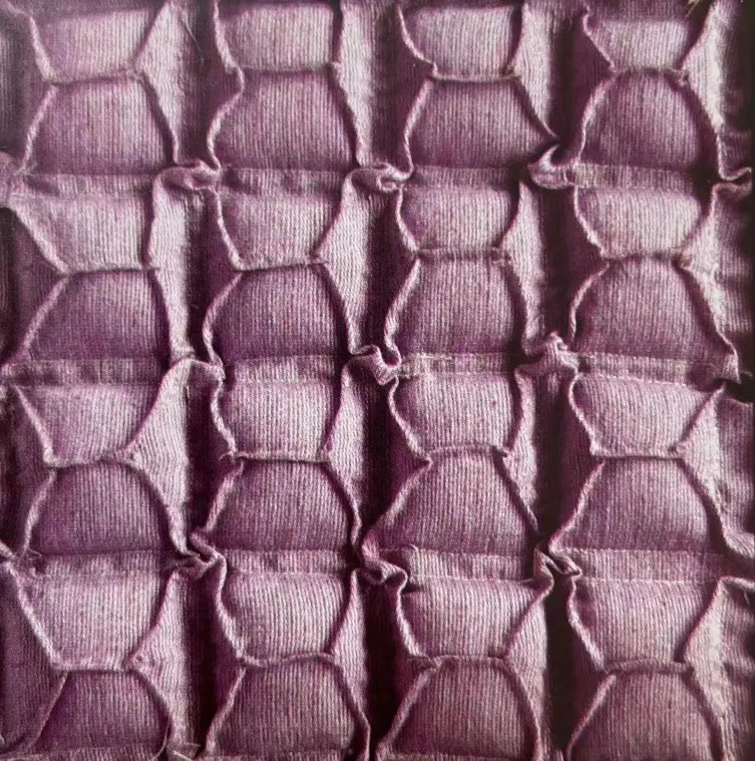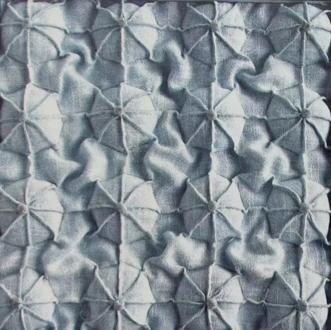这组创意面料作品所使用的工艺都是绗缝的方法。设计师在工艺实验后,认为第一幅面料的效果很有趣,联想到中式建筑的屋顶,于是着手收集各种建筑的造型,从中选出几款各国著名建筑的图片,通过绗缝工艺来表现这组建筑物的屋顶造型。
