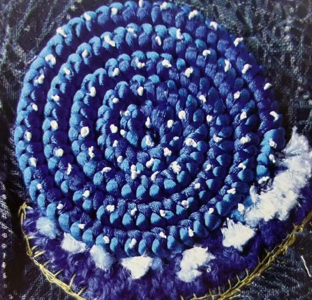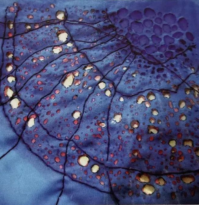 用线镶在上下三层化纤面料上,烙出大小不等的孔洞,蓝色表面上露出一点粉色点缀,再用深色线迹绣出环状的轮廓,模仿显微镜下细胞的水泡效果。