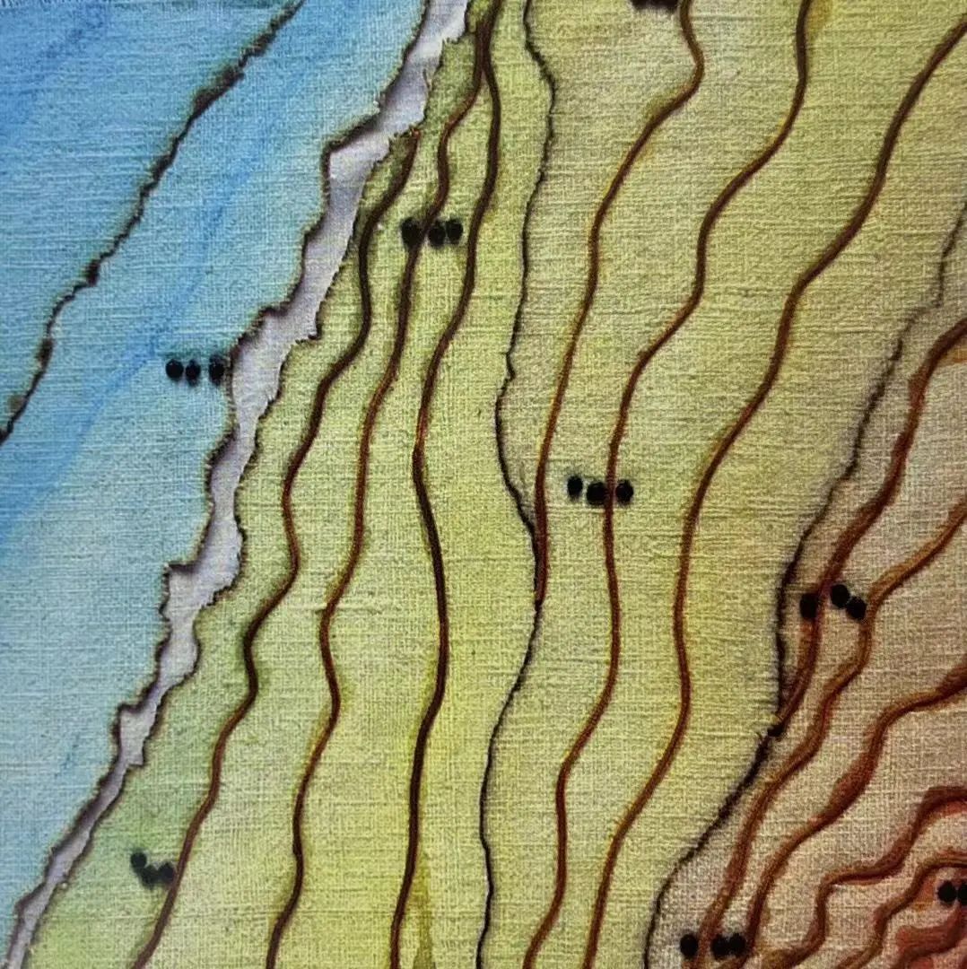 创意灵感来源于一张早年出版的古旧发黄的地图。制作时先按地图的色彩把白色的麻质面料染色,然后剪出需要的形状再烧边,最后用钉上黑色小珠子的红色细绳,模仿标注海拔的地图效果。