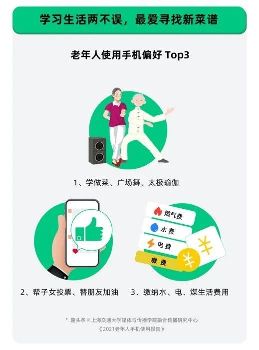 10月13日,嘉定互联网企业趣头条联合上海交通大学媒体与传播学院融合传播研究中心、澎湃新闻发布了《2021老年人手机使用报告》(以下简称《报告》),聚焦60岁以上老年人智能手机使用情况,特别关注智能手机与老年人在亲子沟通、家庭关系、社会参与等行为中的关系。