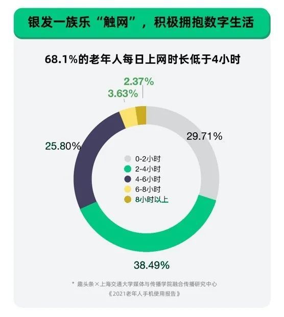 当老年人拥有智能手机,如愿以偿在数字化大潮中自由冲浪,《报告》指出,68.1%的老年人上网时长低于4小时,其中29.71%的老年人上网时间低于2小时,持续积极拥抱数字生活。
