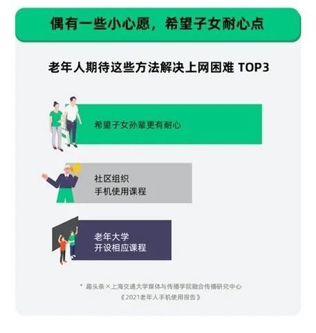 虽然老年人已经习惯使用手机来获取信息,但横亘在他们面前的现实问题是,对于信息的识别能力和判断力,他们比年轻人低很多,再加上年轻人对初次迈入网络世界的老年人缺乏耐心,对老年人的信息分享往往没有正面反馈,导致老年人对学习智能手机使用缺乏信心。