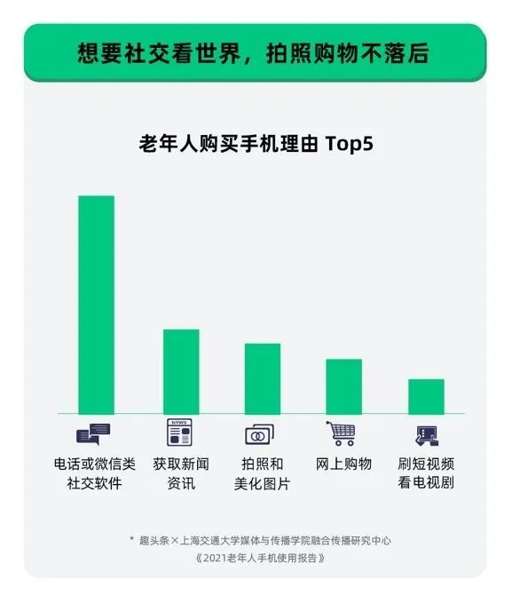 《报告》显示,在老年人购买智能手机的理由中,“打电话、使用微信等社交软件”位列TOP 1,老年人渴望用新的通讯工具与亲朋好友连接,以满足自身情感互动的精神需求。此外,获取信息、了解世界对老年人来说也十分重要,受身体机能限制,老年人无法随心所欲、说走就走,但足不出户不代表心灵闭塞,通过手机同样能“知晓天下事”。拍照美图和网上购物是老年人想要尝试的新鲜事物,而在短视频风靡的当下,刷短视频已然成为老年人消磨时间的主要休闲娱乐方式之一。