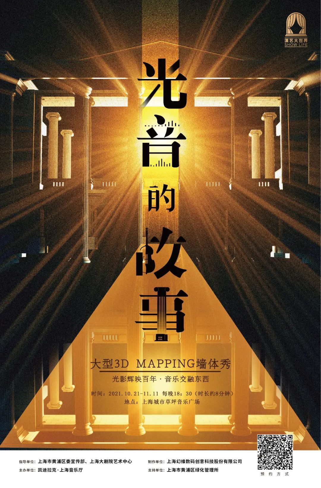 10月21日-11月11日每晚18:30,上海音乐厅推出“光音的故事”——大型3D Mapping墙体秀。演出期间,墙体秀将利用虚拟光影和真实光影结合,打破建筑墙面空间限制,让“城市音乐客厅”化身流动的字节和音符,实现视觉艺术与历史建筑的融合。每周四13:00开放下一周的预约场次,市民可点击文末“阅读原文”进入预约页面。详见↓