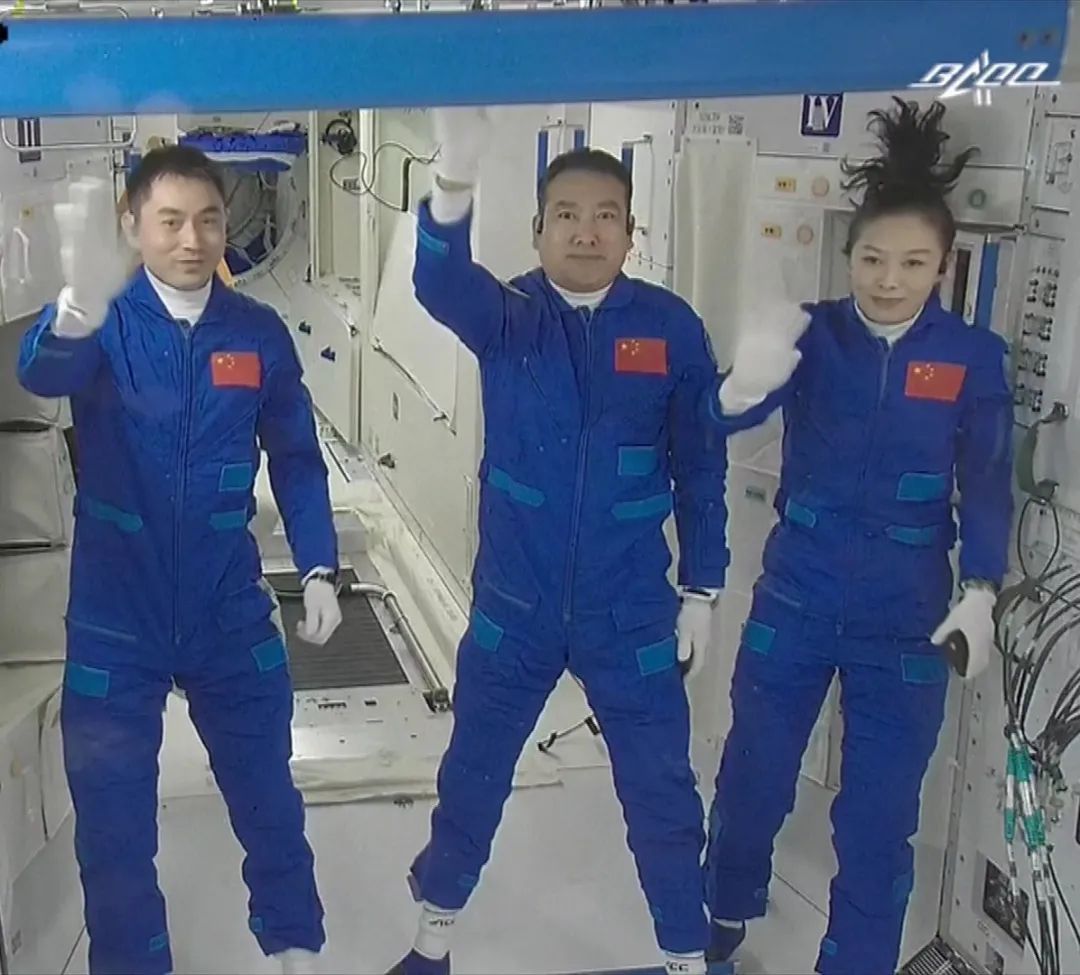 △航天员王亚平(右一)与同事翟志刚、叶光富进驻中国空间站