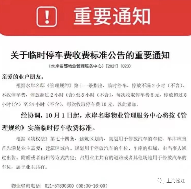 9月18日,一则《关于临时停车费收费标准公告的重要通知》打破了永丰街道麓园·水岸名邸小区业主群的平静。根据《通知》要求,从10月1日起,小区地面所有车位均变为临时车位,且物业将实施新的停车收费标准:所有停放在地面的车辆时间超过8小时,收费为10元。