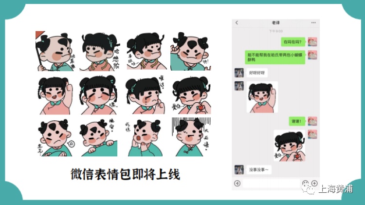 国庆节后,上海哈尔滨食品厂有限公司副总经理邵萍在微信聊天时,就频频用起了一组中国风卡通娃娃的表情包,穿着中式服装的中国娃娃脸上带着圆圆的两朵腮红,用各种表情表达出“哈嫌弃”、“哈想侬”的意思。而这套表情包,也出自于这群“00后”之手。