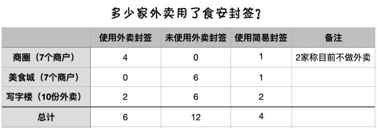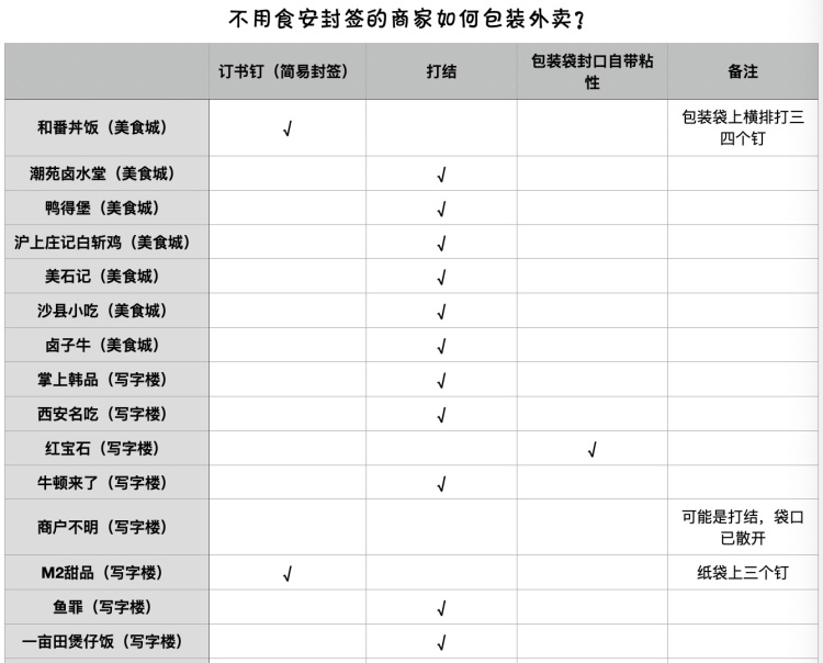 也就是说,在有外卖业务的22个商户中,7家较规范的使用了封签,而15家采用了别的打包方式。