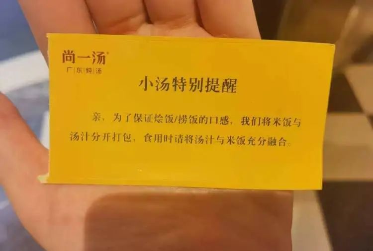 上面还有“小汤特别提醒”,提示顾客为了保障口感请将分开打包的汤汁与米饭充分融合。