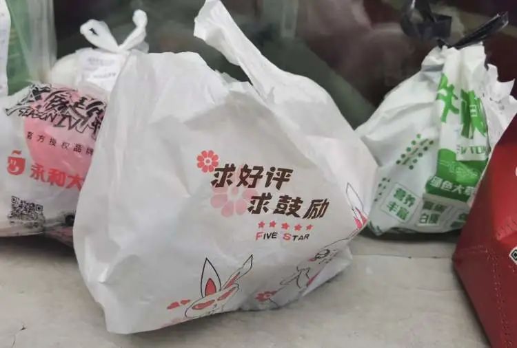 另外,写字楼前有一袋永和大王的外卖也用的是透明胶带,但却在袋口缠绕了好几圈,解开有一定难度。