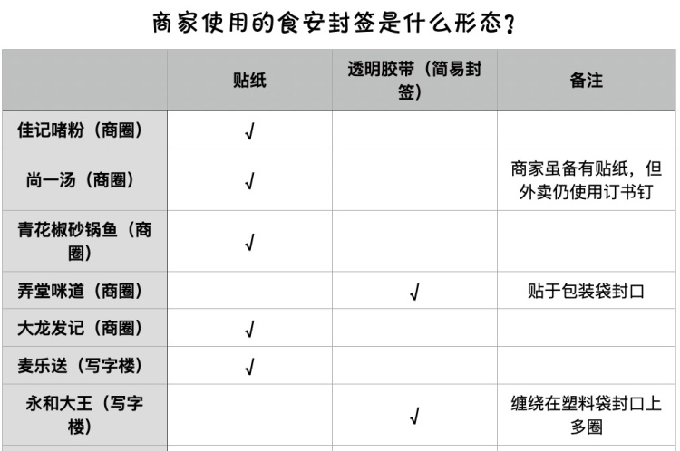测评显示,虽然规范使用食安封签的商家仍是少数派,但有意识为外卖“封口”的商家已越来越多。