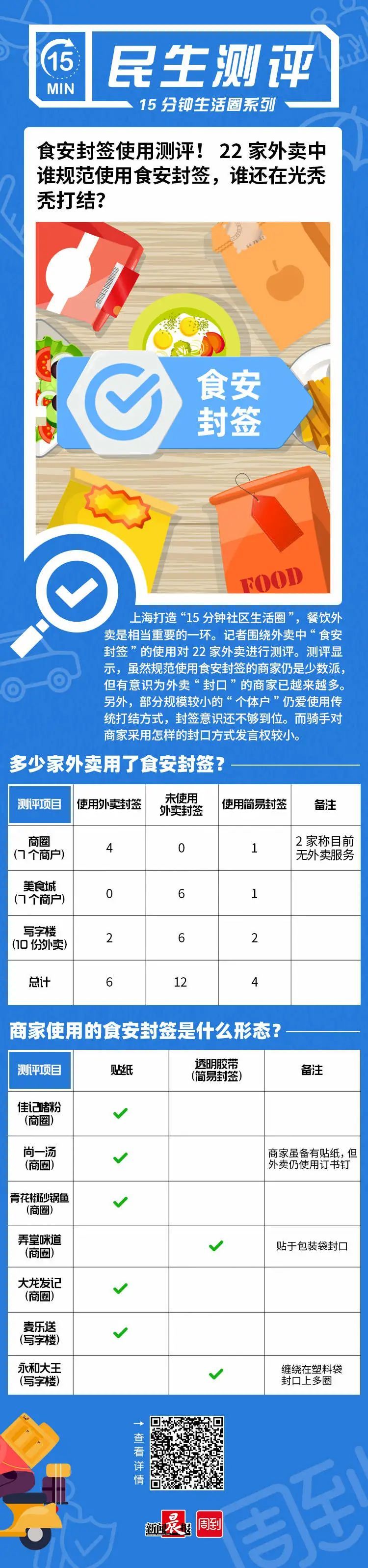 近期,新闻晨报·周到与上海市消保委围绕外卖中“食安封签”的使用展开联合测评,分别在一家食安封签情况较好的示范商圈,一家白领午餐集中的美食城,以及一栋设有外卖放置柜的写字楼采访收集外卖封签使用情况,获得相关数据。