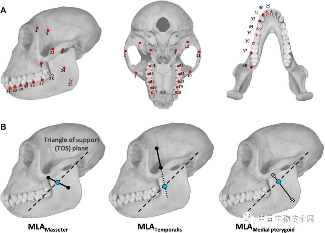 在这项研究中,研究人员为从小狐猴到大猩猩等21种灵长类动物的头骨和牙齿创建了3D生物力学模型,并模拟了在这些物种的整个生长过程中每个主要咀嚼肌的附着位置。
