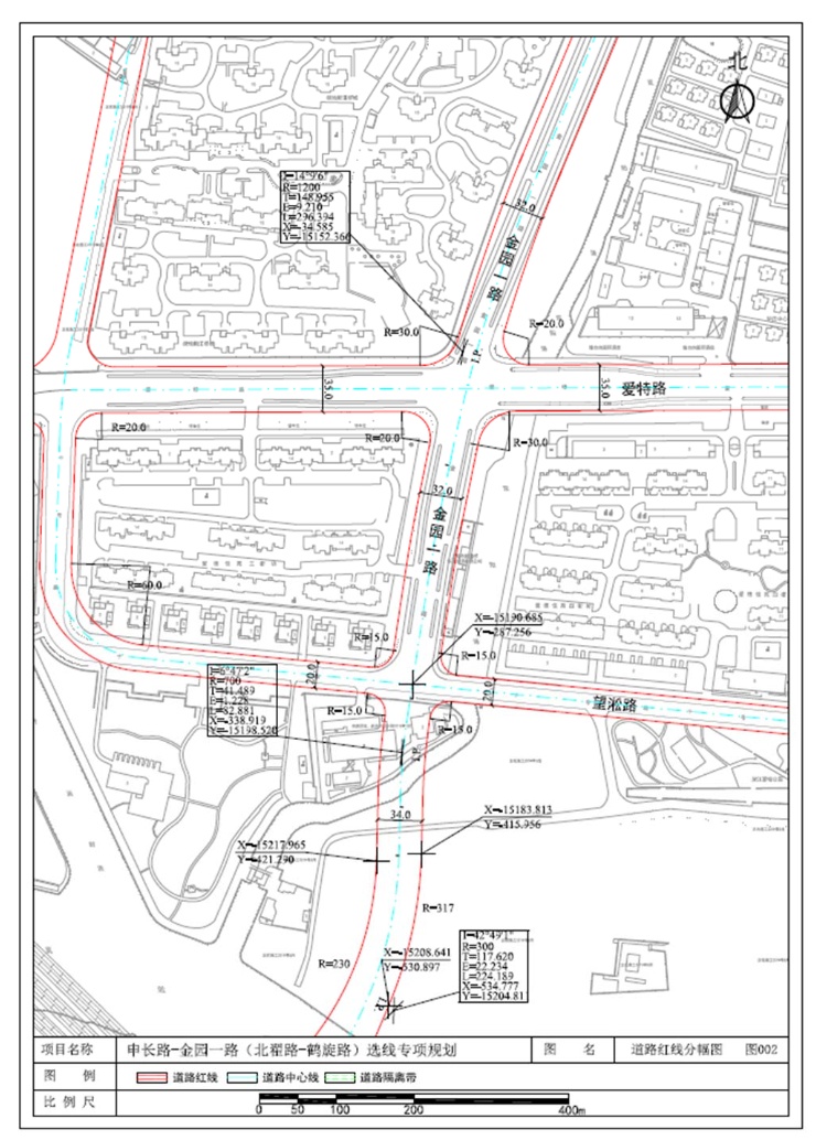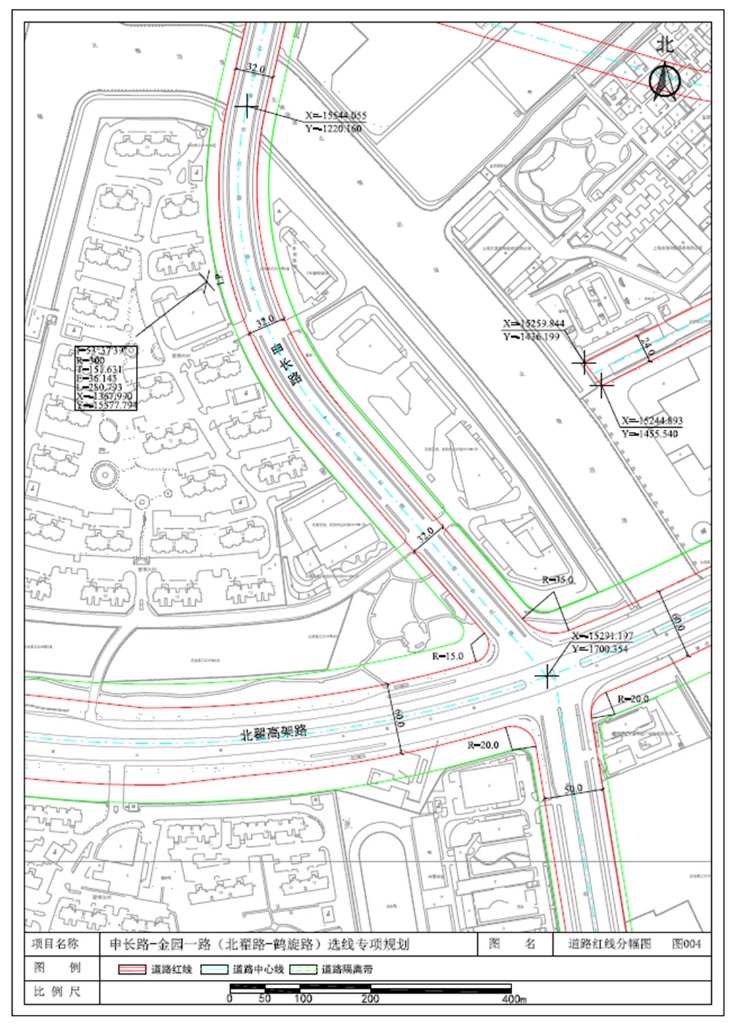 申长北路-金园一路(北翟路-鹤旋路)规划红线宽32米,绿化隔离带宽度10米。(见图4)