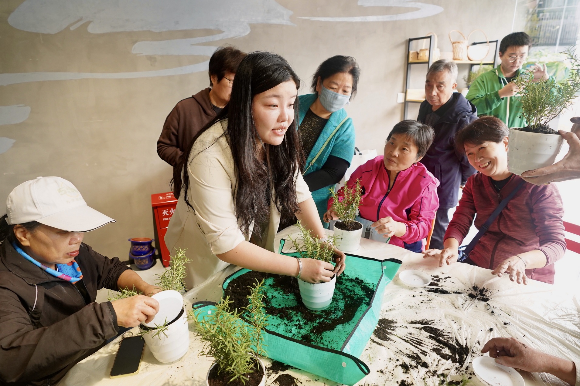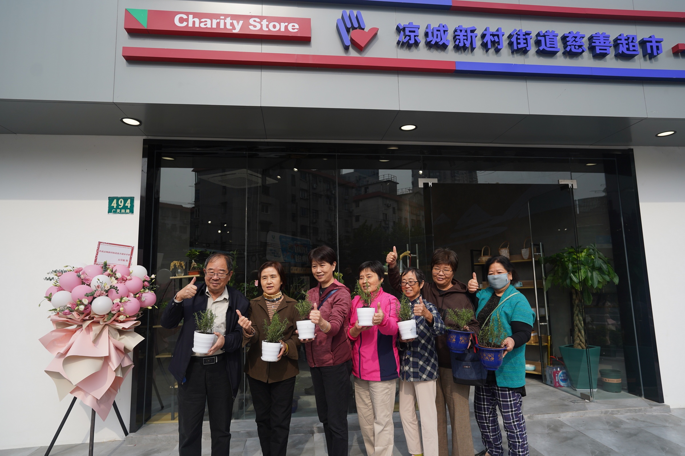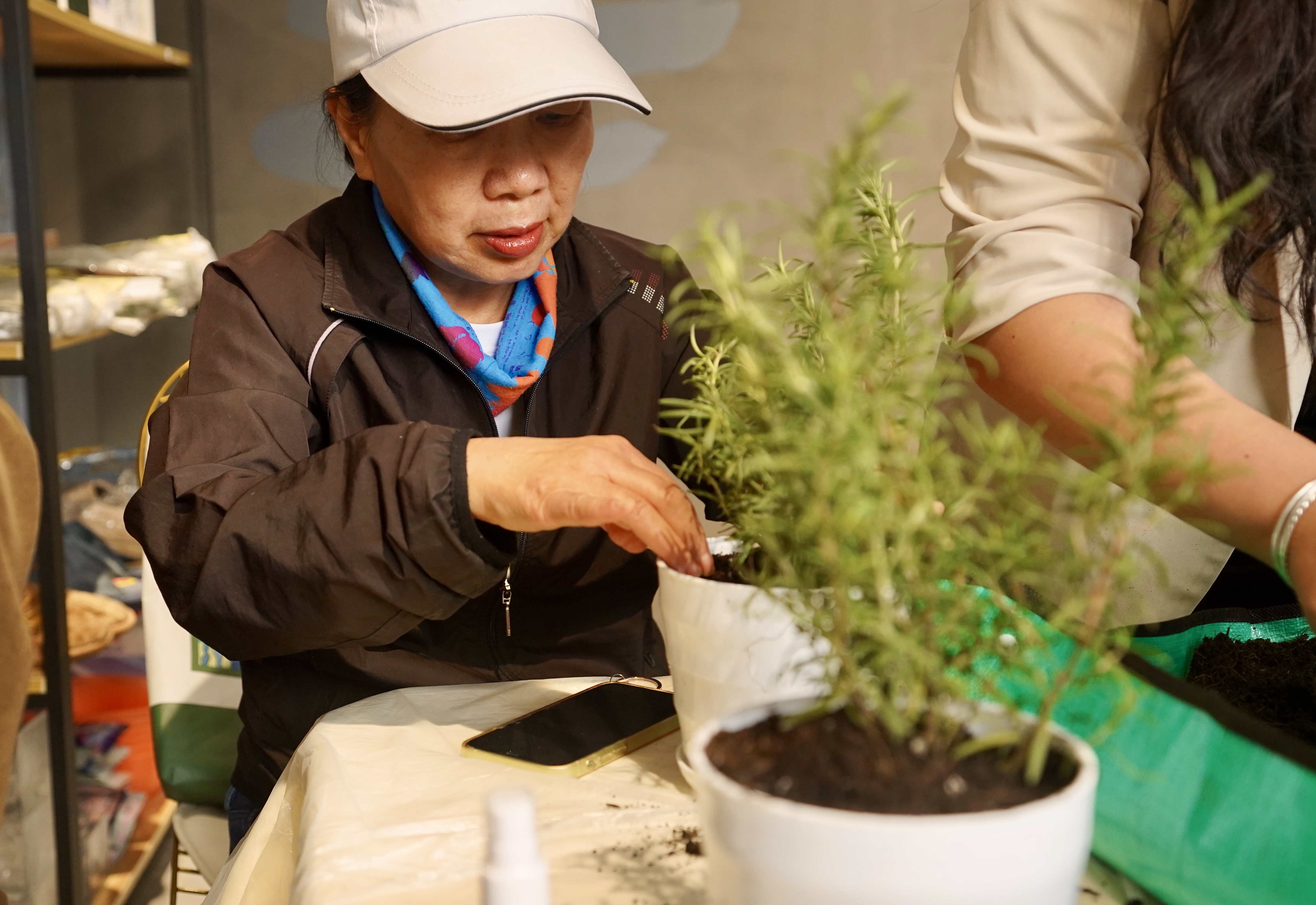 另一边的慈善超市内,一场小型花艺课正在进行中,几位社区居民在老师的带领下亲手栽种迷迭香,并饶有兴致地询问后期的养护心得。