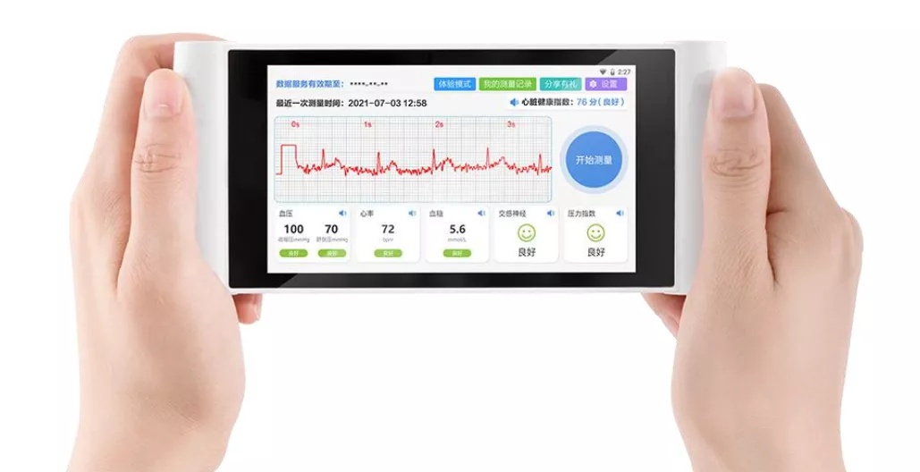 记者了解到,无创血糖智能设备如同一个简易版的手机,测量时,只要把手轻轻握住两端,保持30秒,就可以测量血压、血糖、心率、心电图、交感神经、压力指数等6项身体指标,并通过互联网自动传送至智能慢病管理APP。和传统血糖仪相比,无创血糖智能设备简单又方便,最重要的是不用扎针就能连续监测,待机时间约21天。