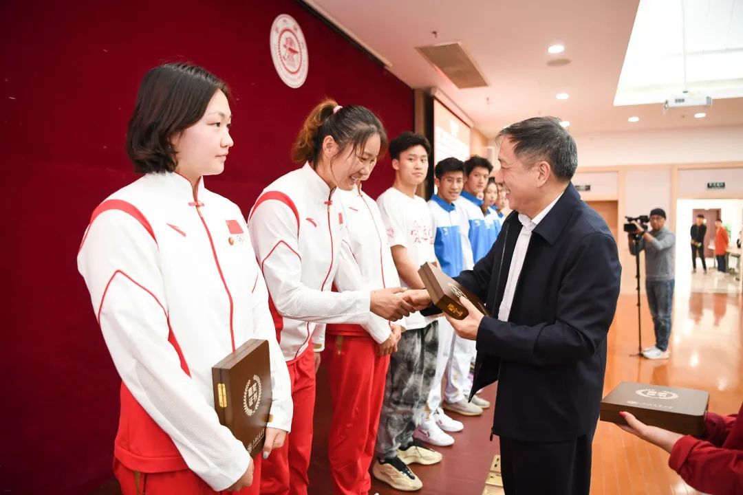 为表彰和进一步弘扬新时代交大人展现出来的积极进取、奋勇争先的良好精神风貌,上海交大对在东京奥运会、第十四届全国运动会、第十四届学生运动会上取得优异成绩的46名学生进行了嘉奖。上海交大学生工作指导委员会秘书长侯士兵宣读嘉奖令,上海交大党委书记杨振斌为获得嘉奖的学生代表颁发嘉奖证书。