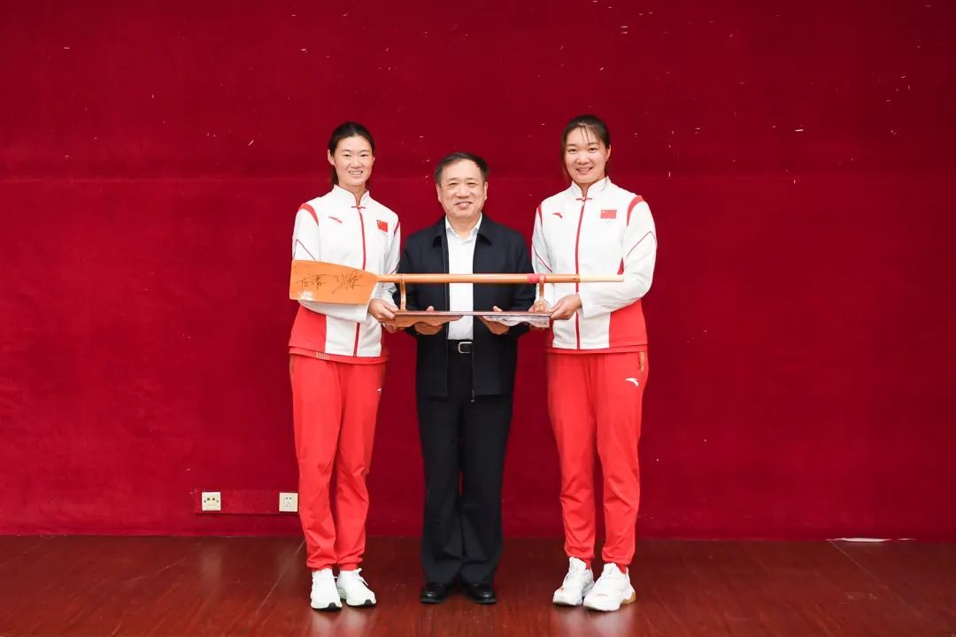 李冰洁、张灵、陈云霞三位奥运冠军准备了比赛纪念品赠送给母校。李冰洁赠送的是比赛运动服;张灵、陈云霞赠送的是一只赛艇桨叶,祝福学校和所有师生乘风破浪,一往无前。在交流发言中,三位奥运冠军分享了自己训练和比赛、来交大读书学习的感受和体会。