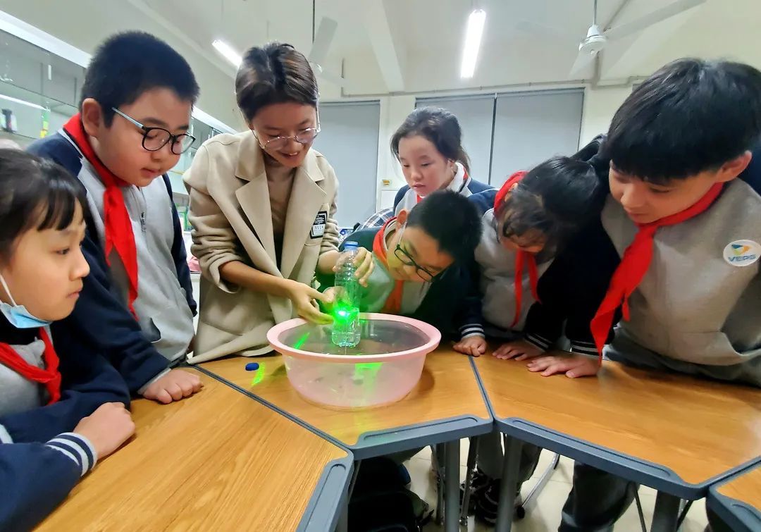 一只手电筒射出的光,透过水与牛奶的混合液,出现了神奇的“人造彩虹”;一支激光笔的光束穿过狭小的指缝,产生了一束条纹……大学生志愿者一边耐心地向学生讲解光的衍射、三棱镜分光、丁达尔效应等科学知识,一边指导学生运用准备好的手电筒、水槽、平面镜等器材做了演示实验。