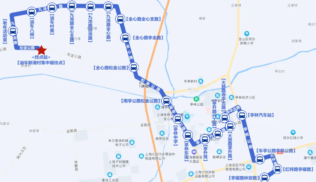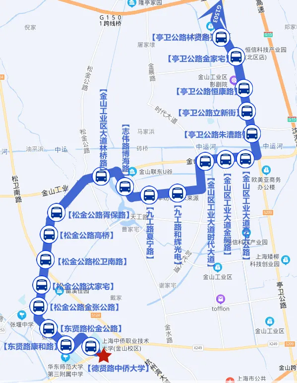 德贤路中侨大学、东贤路康和路、东贤路松金公路、松金公路金张公路、松金公路沈家宅、松金公路松卫南路、松金公路高桥、松金公路胥保路、金山工业区大道林桥路、志伟路博海路、九工路夏宁路、九工路和辉光电、金山工业区大道时代大道、金山工业区大道金舸路、金山工业区大道亭卫公路、亭卫公路朱漕公路、亭卫公路立新街、亭卫公路恒康路、亭卫公路金家宅、亭卫公路林贤路、莲花路地铁站(北广场)。