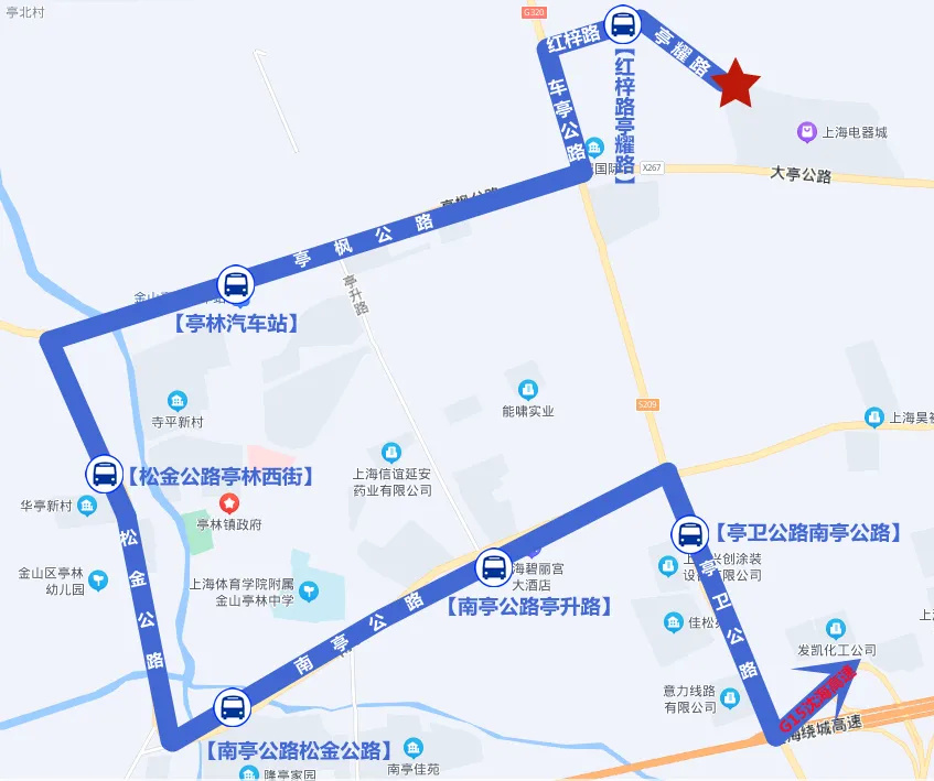 亭耀路林安路、红梓路亭耀路(下行亭耀路红梓路)、亭林汽车站、松金公路亭林西街、南亭公路松金公路、南亭公路亭升路、亭卫公路南亭公路、莲花路地铁站(上行下客站)、梅陇汽车站。