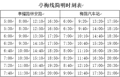 首末班车:亭耀路林安路 5:00~20:00;梅陇汽车站 6:00~21:00;全程线路约46.5公里,票价为8元。